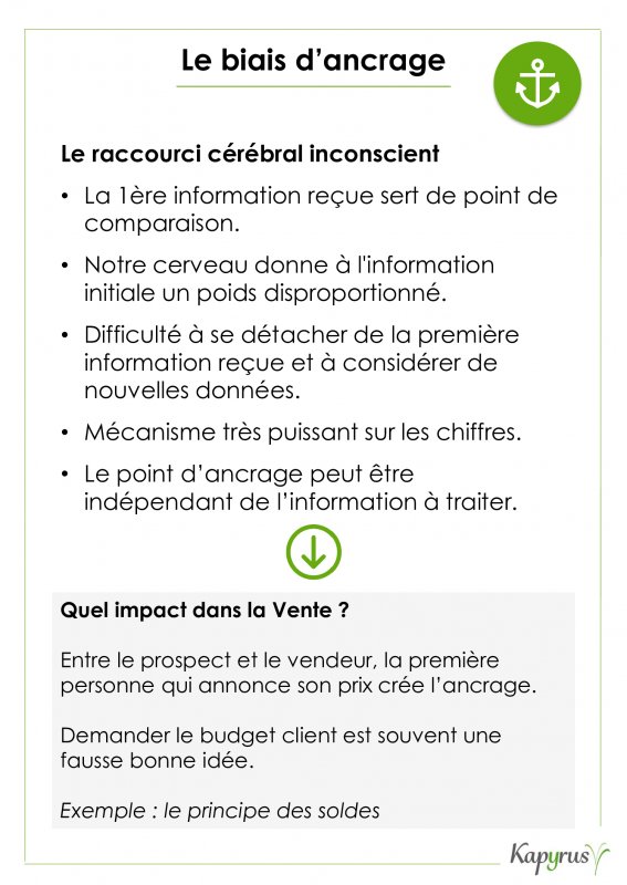De nombreux biais sont présents dans la relation client et la vente avec un impact souvent sous-estimé. Le biais d'ancrage est particulièrement puissant avec les chiffres et il a été étudié à de multiples reprises depuis les années 70 notamment par Daniel Kahneman et Amos Tversky 1
